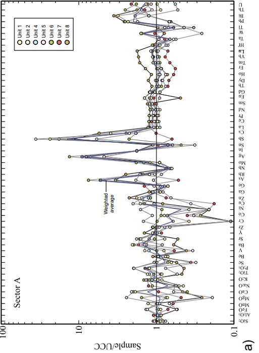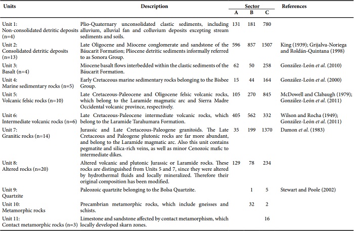 The concentration average of each measured element was obtained considering the number of samples, and weighted taking into account the exposure area for each lithological unit from sectors A, B and C. Then, weighted average values of major and trace element for the three sectors were used to obtain the natural geochemical background of rocks from the entire Sonora river upper basin. Because of the comparatively small area covered by quartzite and regional metamorphic rocks of units 9 and 10, respectively, they were not considered in the calculation.