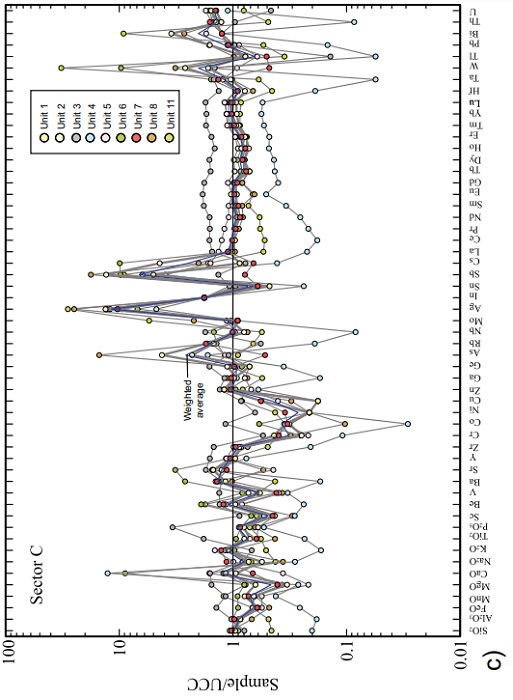 The concentrations of CaO and P2O5 are around 1.5 times the UCC abundance, which is relatively more obvious in Sector C (Figure 4). The CaO anomaly may be associated with limestone, intermediate and felsic volcanic rocks, as well as with altered rocks. The relatively high values of P2O5 may be due to the influence of volcanic rocks. In contrast, Na2O is slightly depleted, probably indicating it was partially removed in solution. Moreover, manganese is commonly removed by hydrothermal fluids and weathering processes, and further deposited in cavities, fractures and crusts, mainly as oxides, hydroxides or carbonates (Figure 3).