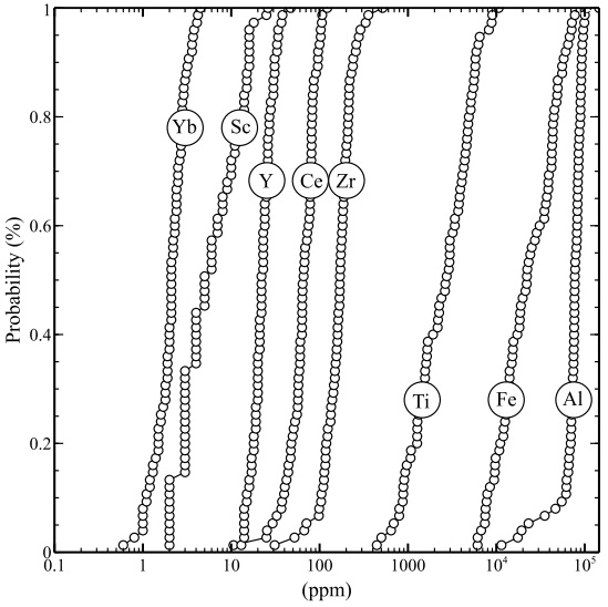 Elements that are abundant in the Earth´s crust, and their concentrations are not substantially changed by human activities and the biogeochemical cycles, are referred to as conservative or reference elements (Galuszka and Migaszewski, 2011), which include Al, Zr, Sc, Cs, Ti, Y, Ce, among others. The coefficient of variation, defined as the ratio of the standard deviation (σ) to the mean (x), is used to determine the conservative capability of an element (Reimann and de Caritat, 2005). However, some elements, traditionally considered as conservative, may display a similar or higher variability than certain elements considered as pollutants in environmental studies (Reimann and Garrett, 2005).