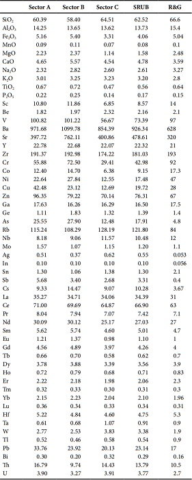 The average concentrations of major and trace elements for samples from the lithological units of sectors A, B and C are shown in Table 2. The weighted average of elemental values of Sectors A, B and C, as well as the entire basin, are shown in Table 3. These values are considered to represent the geochemical background of the study area, and do not have any petrogenetic significance since the lithological units are constituted by geological formations of different nature and age. Figure 3 shows that the lithological units from the three sectors have similar geochemical patterns when normalized to the Upper Continental Crust (UCC) composition proposed by Rudnick and Gao (2003), defining a relatively narrow strip close to the reference line, for most elements, particularly for the rare earth elements group (REE).