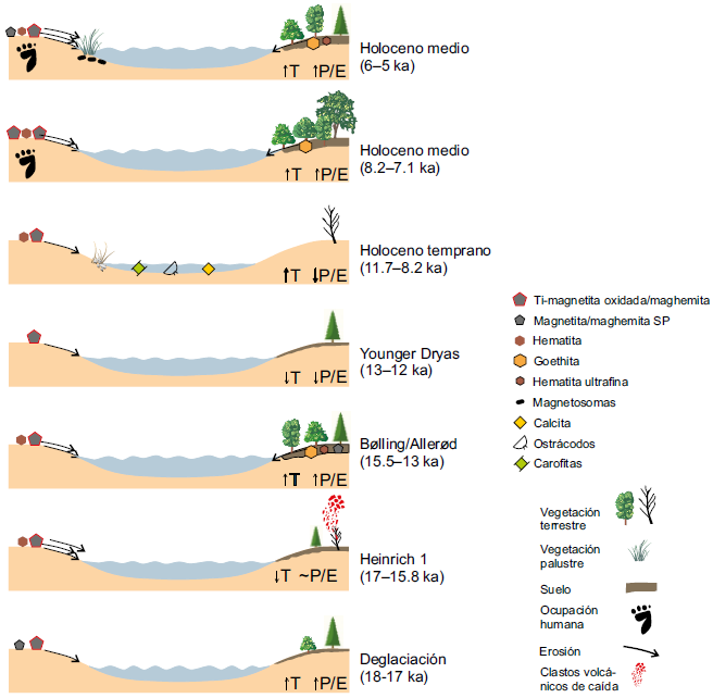 Durante la deglaciación (18000–11700 años cal AP), la escasa cobertura de vegetación terrestre con limitado desarrollo de suelos favoreció un aporte variable y continuo de sedimentos a un lago somero de agua dulce de aguas más frías que las actuales. En este periodo se registró una actividad volcánica explosiva intensa, cuyos productos de caída controlaron la sedimentación clástica. A lo largo del evento Heinrich 1 (H1, ~ 17500–15800 años cal AP), la disponibilidad de materiales volcánicos no consolidados y la contracción de la vegetación terrestre, resultaron en el incremento en la erosión. En la fase inicial templada del intervalo relativamente cálido Bølling/Allerød (ca. 15500–14300 años cal AP), se infiere la existencia de una cubierta vegetal reducida, con suelos bien drenados y una alternancia de periodos secos y húmedos, en los que el aporte clástico a un lago relativamente salino fue limitado. Durante la fase cálida Allerød (ca. 14300–13000 años cal AP), se documentan condiciones más húmedas, con mayor aporte de detritos al lago, mayor productividad biogénica y la expansión de la vegetación terrestre. Para el intervalo frío del Younger Dryas (YD, ~13000–12000 años cal AP), las condiciones de sequía restringieron el aporte de detritos al lago y contrajeron la vegetación terrestre.