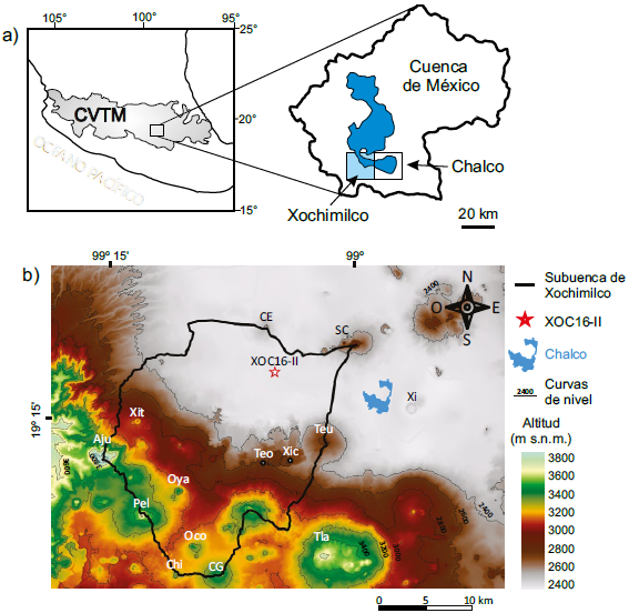 La cuenca de Xochimilco (19°13’ N, 99°08’ O) ocupa la porción sudoccidental de la cuenca de México (Figura 1). Tiene un área de 480 km., de los cuales la planicie lacustre ocupa ca. 130 km. y una altitud de 2240 m s.n.m.; está limitada al norte por el cerro de la Estrella y la sierra Santa Catarina, al este por la divisoria que corre entre la sierra Santa Catarina y el volcán Teuhtli, al sur por los conos y otras estructuras volcánicas de la sierra del Chichinautzin (entre ellos además del Teuhtli, Ocuscayo, Cuauhtzin, Chichinautzin y el complejo Guespalapa); y al sur-suroeste por el volcán Ajusco. Al menos 20 estructuras volcánicas se reconocen dentro de esta cuenca. La cuenca de Xochimilco albergó un cuerpo lacustre que en épocas de niveles altos se conectó al norte con el lago de Texcoco y al este con el lago de Chalco. Actualmente los remanentes del lago se limitan a la zona de las chinampas que ocupan un área de ca. 16 km2, y se localizan al noreste de la cuenca.