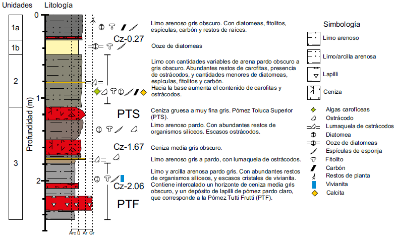 La secuencia fue dividida en tres unidades de acuerdo con los componentes, (Figura 2). La unidad basal 3, de 2.47 a 1.10 m de profundidad, está constituida por limo y arcilla arenosa gris a pardo con abundantes restos de organismos silíceos; contiene cuatro de los cinco depósitos volcaniclásticos reconocidos: los depósitos de las pómez PTF y PTS, así como las cenizas denominadas en este trabajo Cz-2.06 y Cz-1.67 (de acuerdo con su profundidad en la secuencia). La unidad 2, de 1.10 a 0.48 m, está compuesta por limo gris obscuro con cantidades variables de arena y abundantes restos de carofitas (algas multicelulares que forman incrustaciones de calcita en sus superficies) y ostrácodos, y escasos cristales de calcita. La unidad 1 fue subdividida en las unidades 1a y 1b. La subunidad 1b, de 0.18 m de espesor, está compuesta por un ooze de diatomeas; la subunidad 1a, de 0.30 m de espesor, está constituida por limo arenoso gris obscuro que contiene abundantes restos silíceos, carbón y raíces de plantas, en los que se encuentra la ceniza Cz-0.27 de 2 cm de espesor.