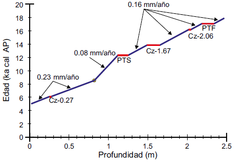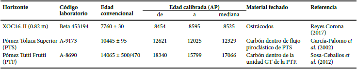Se obtuvo un fechamiento 14C AMS en un concentrado de ostrácodos a 0.82 m de profundidad (7760 ± 30 años AP, Beta 453194). Para la elaboración del modelo se consideraron las edades calibradas de los marcadores estratigráficos reconocidos, la Pómez Tutti Frutti y la Pómez Toluca Superior, y la edad de 14C (Tabla 1). La calibración de las edades se llevó a cabo con el programa OxCal 4.2 (Bronk Ramsey, 2009) utilizando la base de datos IntCal13 (Reimer et al., 2013). El modelo se elaboró a partir de la interpolación lineal de las edades calibradas, restando el espesor de los depósitos de tefras, ya que se considera instantáneo su depósito. La edad de la cima de la secuencia se estimó en ca. 5000 años cal AP, y la base en ca. 18000 años cal AP (Figura 3). Las tasas de sedimentación calculadas entre los horizontes de edad conocida varían entre 0.08 y 0.23 mm/año (Albarrán-Santos, 2018).