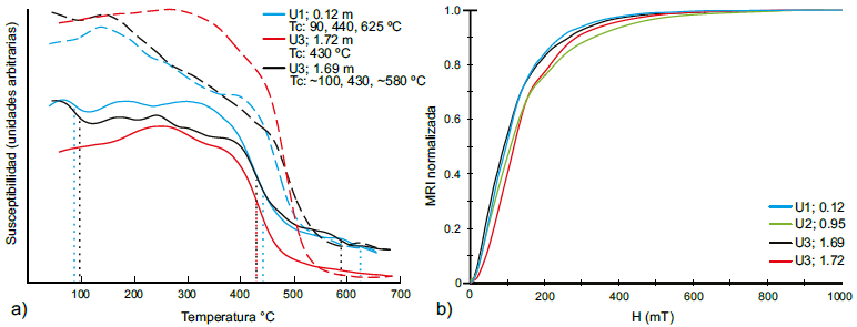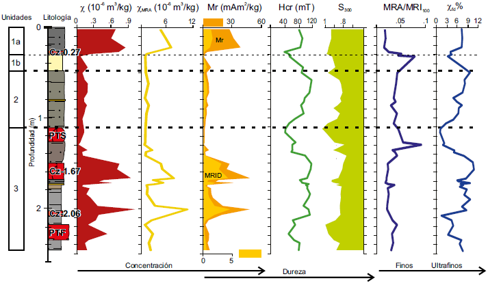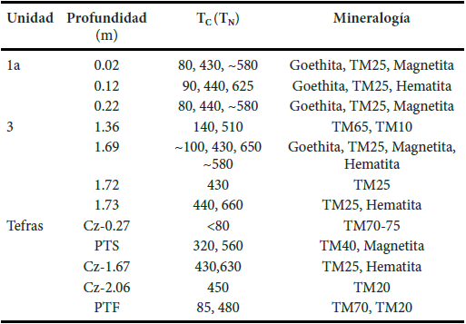 Los sedimentos entre la PTF y la ceniza Cz-1.67 m presentan mayor concentración de minerales magnéticos (> χ, Mr), con una mezcla de tamaños MD (< MRA/MRI) y SP (> χfd%) y de relativamente mayor dureza (>Hcr y MRID, < S300), que aquéllos en la base y la cima de esta unidad (Figura 4). De acuerdo con las curvas κ-T, el limo pardo gris de esta unidad (1.72 m), presenta una mineralogía dominada por Ti-magnetitas Tc~ 430 (Tabla 2; Figura 5a). En el limo arenoso (1.69 m), el decremento a 100 °C en la curva κ-T indica la presencia de goethita además de Ti-magnetita y magnetita (Figura 5a); aunque en la curva de adquisición de MRI presenta una dureza magnética menor que aquella del limo pardo gris (1.72 m) (Figura 5b).