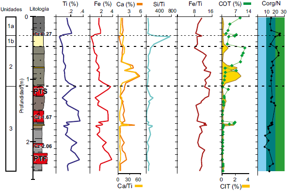 En concordancia con los parámetros magnéticos, en la unidad 3 se presentan las concentraciones más elevadas de elementos “detríticos” como Ti y Fe; así como valores relativamente bajos Ca, Ca/Ti y Si/Ti, y moderados Fe/Ti (Figura 6). El contenido de carbón tanto orgánico (COT) como inorgánico (CIT) es muy bajo, excepto alrededor de 1.72 m, que corresponde a una lumaquela de ostrácodos. El cociente Corg/N muestra valores intermedios en la base (~ 11), que entre 2.05 y 1.85 m de profundidad disminuyen a 7, y hacia la cima aumenta hasta 17; justo debajo de la PTS (1.34-1.25 m) disminuyen a ~14.