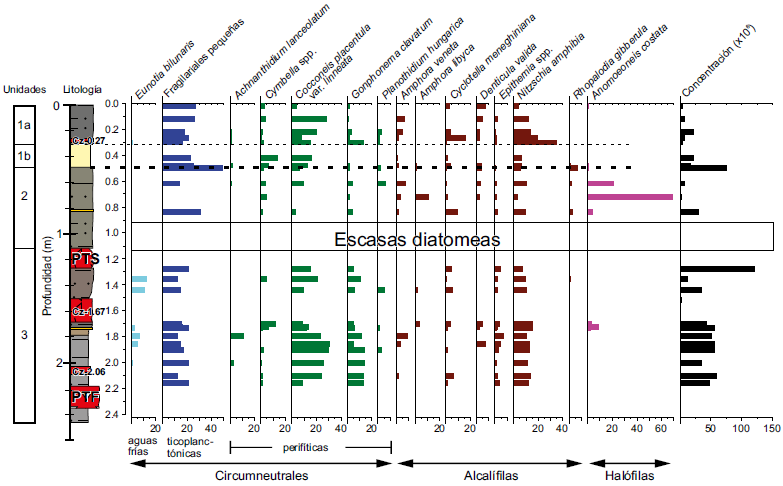 En la subunidad 1b se registra un nuevo aumento en la abundancia de las pequeñas arrafidales y de C. placentula var. linneata, que coincide con el aumento en la concentración de diatomeas. La subunidad 1a presenta concentraciones de diatomeas intermedias a bajas, con valores que oscilan entre 20 y 4 ×106 v/gss. En cuanto a los conjuntos de diatomeas, vuelven a ser muy similares a los presentes en la Unidad 3, si bien con un máximo de abundancia inicial de la especie alcalífila Nitzschia amphibia y, en general, con abundancias muy bajas de Gomphonema clavatum y sin la presencia de Eunotia bilunaris.