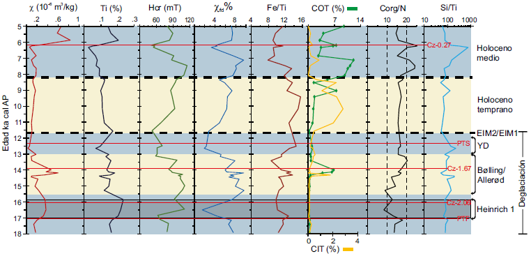 El intervalo frío del Younger Dryas (YD, ~ 13000–12000 años cal AP), marcó un cambio respecto a las condiciones ambientales previas: disminuyó el aporte de detritos (< χ, Ti, Hcr) y la formación de minerales magnéticos duros, como hematita y goethita (< Hcr) (Figura 8). La vegetación terrestre se contrajo y aumentó la concentración de diatomeas (y, en general, del sílice biogénico, > Si/Ti), que señalan la existencia de un lago somero de agua dulce y fría. Estas características indican la existencia de condiciones secas, que restringieron el aporte de detritos al lago y que limitaron el intemperismo, lo que resultó en una menor formación de óxidos de Fe.