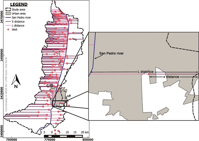 To estimate the underground drainage, the methodology described by Cuthbert (2010) was considered. As mentioned earlier, this author proposed a conceptual model with the section of a free aquifer of length x = L. In the study area, this model is represented by a section of the basin of the Aguascalientes valley, where the San Pedro River would form a constant hydraulic head boundary, while the model periphery represents a no-flow condition at x = 0 as shown in Figure 5 (see also Figure 2 and Eq. 3).