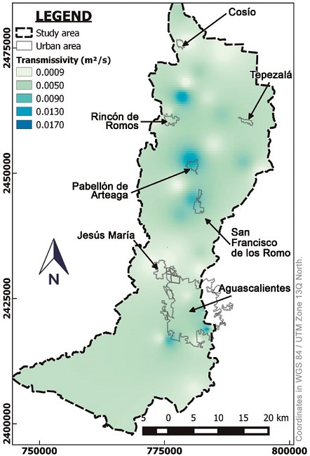 The values of transmissivity were taken from reports of various agencies of both public and private sectors (Table 1). Similarly, as was done for creating a map of Sy, the B-Spline Multilevel technique was used as an interpolation method to obtain the distribution of the transmissivity distribution in the study area as shown in Figure 6.
