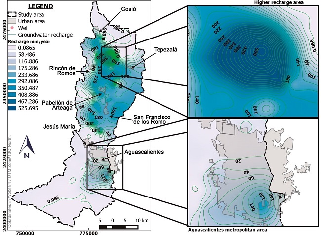 When comparing the recharge estimated in this study with that estimated by UNAM-UAQ (unpublished data, 2002) using natural tracers (O-18 and Deuterium) the zones with the largest potential for recharge coincide with the results estimated in this investigation. Furthermore, they also determine that the zone with the lowest potential for recharge is within the city of Aguascalientes, which also coincides with the results presented here.