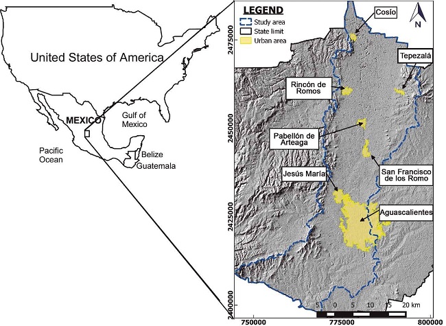 The study area corresponds to the valley of Aguascalientes in the state with the same name, occupying a strip having a North-South orientation and extending a length of approximately 80 km and a width of 25 km as shown in Figure 1. This zone is in a tectonic graben as described by Aranda-Gómez (1989).