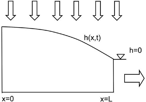 The calculation of the drainage is based on the one-dimensional Boussinesq equation of the groundwater flow for an aquifer that receives homogeneous recharge and that follows a sinusoidal pattern. The applicable equation is the following:
