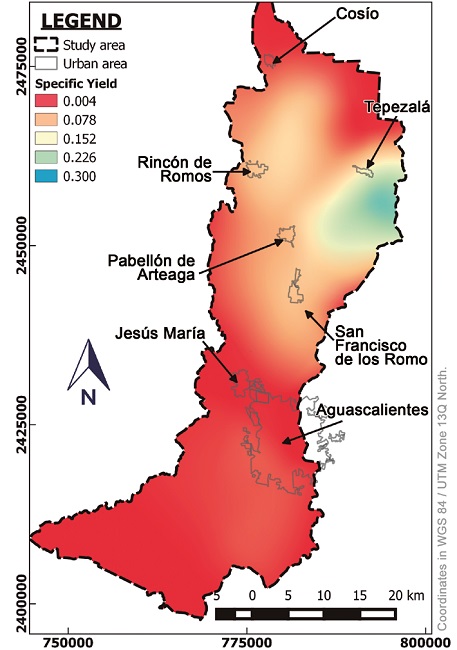 The distribution of the specific yield throughout the study zone was mapped based on the results of two previous investigations, (UNAM-UAQ unpublished data, 2002; CONAGUA 2015).