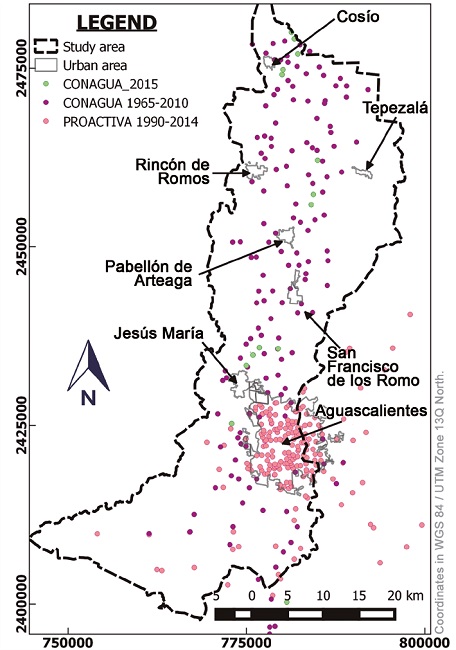 Groundwater levels were obtained by analyzing data provided by government agencies such as PROACTIVA medio Ambiente CAASA, which is the company commissioned for the distribution of water in the municipality of Aguascalientes, and the CONAGUA. Both agencies provided the static water levels of wells measured throughout the Valley during the period 1968-2015. This investigation focuses only on the period between 1985 and 2015. Figure 4 shows a map with the location of the wells with the provided data, the measurements in the wells are mostly annual and sometimes monthly.