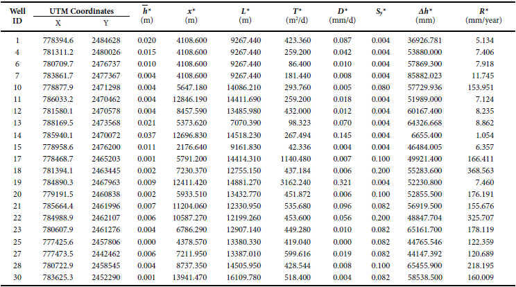 The GWR was calculated for each of the 145 wells using Eq. 3 along with the isocurves from Figures 3 and 6. The calculated GWR and the parameters used in the computation are compiled in Table 2 (which only shows the results of 30 wells for brevity). This table also includes some of the annual data over the span of the 30-year analysis.