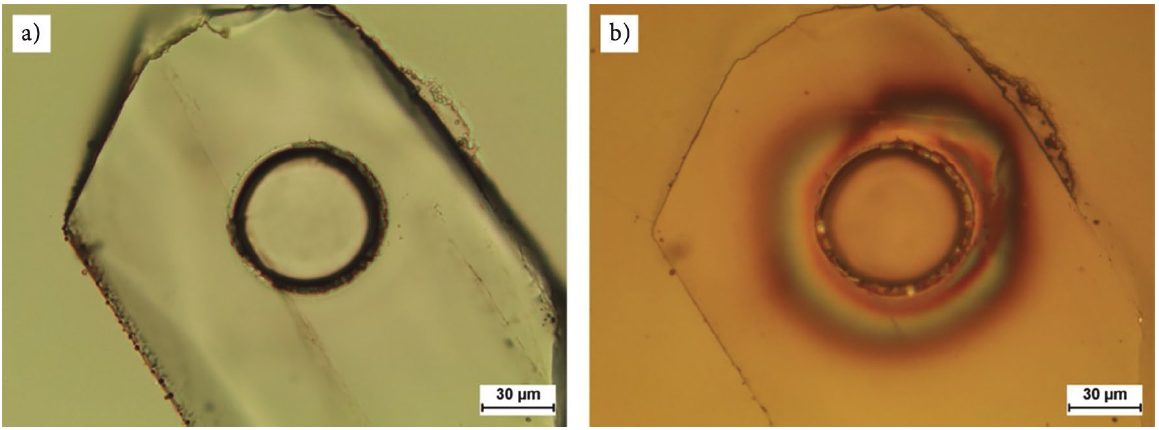 Spot analyses were performed with a Resonetics RESOlutionTM LPX Pro (193 nm, ArF excimer) laser ablation system, coupled to a Thermo Scientific iCAPTM Qc quadrupole ICP-MS at LEI. Different analytical protocols were employed for zircon and apatite. For zircon, each spot analysis consisted in the acquisition of 15 s of background signal (gas blank), 30 s of ablation, and 15 s to allow the signal to reach the baseline again (wash-out). The spot diameter was of 23 µm, using a fluence of 6 J/cm2 with a repetition rate of 5 Hz. For apatite, 35 s of ablation was chosen with the same gas blank and wash-out acquisition times as given above. In this case, a spot of 60 µm was employed, basically to obtain a larger volume of the ablated material to be analyzed with the purpose of compensate for weaker signals of U and Pb. Due to different coupling of laser energy in different materials, the laser pulse energy and repetition rate were reduced to 4 J/cm2 and 4 Hz, respectively. For both zircon and apatite, 350 ml/min of He was used as a carrier gas, mixed in the cell with ca. 800 ml/min of Ar. Four and three ml/min of N2 for zircon and apatite analyses were also added after the cell, respectively, to increase the sensitivity of the plasma. A “squid” signal homogenizer is located right after the ablation cell, to mix properly all the gases added before reaching the plasma. Single-spot analyses in apatite were performed in inclusion-free grains or in those parts in which no visible inclusion or other defects were present (e.g., see in Figure 2).