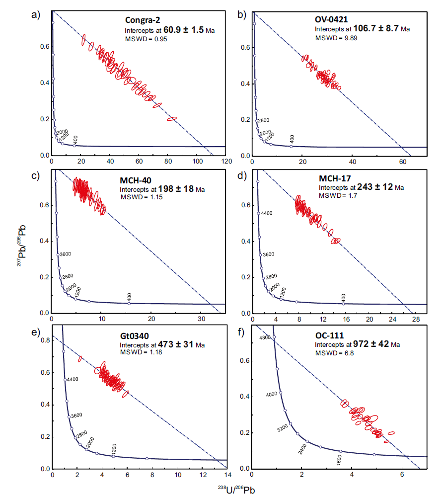 Apatite from the youngest sample Congra-2 show a well-defined linear regression in the T–W diagram, which is derived from all the 34 single-spot analyses performed with LA–ICP-MS. A lower intercept age of 60.9 ± 1.5 (2σ) Ma was detected (MSWD = 0.95; Figure 4a). Despite its young age (Paleocene; Duque-Trujillo et al., 2014), a statistically very reliable apatite U-Pb age was obtained for Congra-2, which is also supported by a MSWD that is close to 1. This is due to high U contents that vary broadly from one apatite to another (31.1 to 371.5 ppm with a mean of 108.2 ppm, standard deviation (SD) = 69.5; Supplementary Appendix A2), which was crucial to yield strongly heterogeneous isotopic ratios for the U-Pb system as well as to generate high levels of radiogenic Pb, and thus displaying a perfect order on the Discordia line (Figure 4a) with a very low age error (only 2.5% at 2σ level).