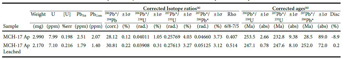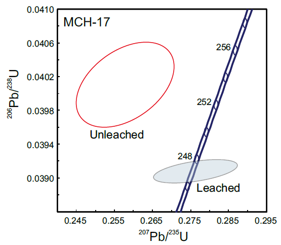 Non-leached apatite of sample MCH-17, dated by ID–TIMS, yielded a reversely discordant 206Pb/238U age of 253.5 ± 2.7 (1σ) Ma (-8.9% of discordance; Table 2; Figure 5). The negative discordance can indicate that these crystals include non-radiogenic Pb in their outermost zones. The leached aliquot, however, yielded a concordant 206Pb/238U age of 247.1 ± 0.8 Ma with a very small 1σ-error (0.3%; Figure 5; Table 2). The results of this single exercise demonstrate that for some samples, such as MCH-17, a rapid acid leaching may be required to remove possible superficial Pb contamination of non-radiogenic origin (e.g., in apatite from weathered rocks).