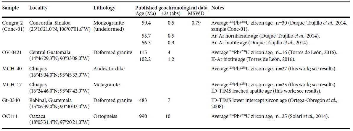 Congra-2 is a monzogranite from the southern Sierra Madre Occidental. For its cognate sample, collected from the same plutonic body, an emplacement age of 59.4 ± 0.5 (2σ) Ma was proposed on the basis of zircon U-Pb results (Sample Conc-01 in Duque-Trujillo et al., 2014). Hornblende and biotite concentrates from Conc-01 yielded Ar-Ar ages at 55.7 ± 0.5 (2σ) and 56.3 ± 0.3 (2σ) Ma, respectively, both cooling ages that were also obtained by Duque-Trujillo et al. (2014).