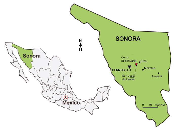 El material estudiado procede del Cerro El Sahuaral, con coordenadas geográficas 29° 19.540' N y 110° 35.834' W, ubicado a 5 km al noreste del ejido de San José de Gracia, en la parte central del estado de Sonora (Figura 1). El Cerro El Sahuaral se localiza a 44 km al noroeste de Hermosillo, siendo esta la ciudad más importante próxima al área de estudio. El Cerro El Sahuaral forma una prominencia aislada con elevación de 370 m s.n.m.