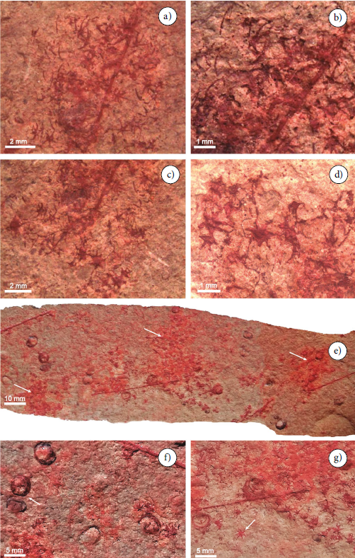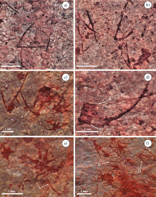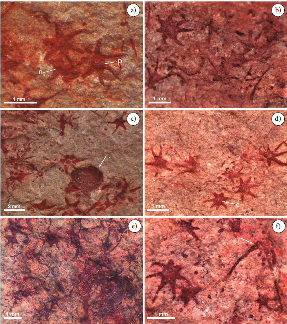 Sobre los planos de estratificación de varias calcilutitas rojizas de 2–3 cm de espesor (USDG 583-587) se observan escleritos aislados (Figura 4a, 4c, 4d, 4f) la mayoría articulados y otros con rayos fragmentados o no preservados. Predominan escleritos de 7+1 rayos pero con 6+1 rayos son comunes. Los rayos de mayor tamaño tienen longitudes de 0.75 hasta 1.7 mm desde la base de inserción con el disco central. Algunos rayos marginales se curvan distalmente con longitudes entre 1.2 y 1.7 mm mientras que los otros son rectos y progresivamente se adelgazan hacia el extremo con longitudes variables entre 0.50–1.5 mm. En algunos escleritos se observa la protuberancia correspondiente a la base del rayo central vertical no preservado. La articulación basal entre los rayos y el disco central varía entre 0.35 y 0.50 mm. En sección basal se observa el foramen circular localizado en la parte proximal de los rayos.