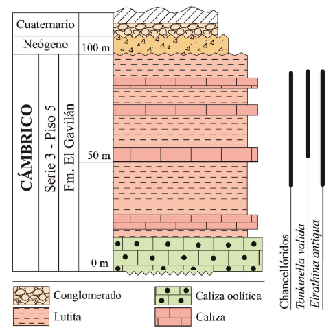 La fauna de chancellóridos aquí estudiada fue recolectada en la Formación El Gavilán una secuencia de plataforma constituida por intercalaciones mayoritarias de calcilutita de tonalidades rojizas con caliza delgada aflorante en la sección estratigráfica de El Sahuaral. Esta formación fue definida en el área del cerro El Chihuarruita, San José de Gracia, su sección tipo, con un espesor de 233 m y por la asociación de trilobites fue asignada a la parte superior de la Zona de Mexicella mexicana, Subzona de Albertella highlandensis, Zona de Ptychagnostus praecurrens (Cuen-Romero et al., 2016). La sección tipo de la Formación El Gavilán en San José de Gracias, se encuentra localizada a 7 km de la sección El Sahuaral, en Sonora central (Figura 2).