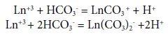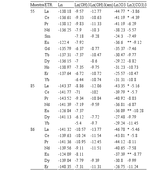 Adicionalmente, las especies acuosas Ln(OH)2CO3-, LnOH(CO3)2-2 y LnOHCO3 fueron excluidas de la base de datos, ya que sus cons tantes de equilibrio sólo se presentaban para el Eu y la existencia de complejos de hidroxicarbonatos de Eu en solución no ha sido demostrada; por otro lado, los estudios de solubilidad de hidroxicarbonatos sólidos del resto de los ETR (LnOHCO3) son escasos (Spahiu y Bruno, 1995).