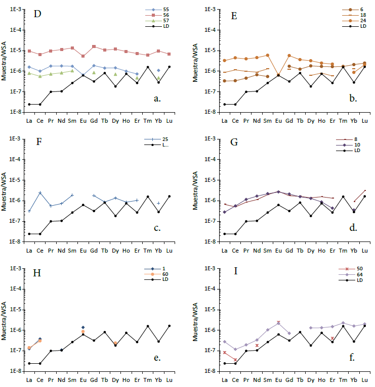 Los grupos D a I (Figura 8a–8f) indican poco fraccionamiento entre los ETRL y los ETRP debido a diferencias en el sentido y la magnitud de las anomalías de Ce y Eu, y la combinación de éstas, sumado a que los valores de YbNS/NdNS son muy pequeños y cercanos a 1 (de 0.191 a 3.132 excluyendo el grupo I).