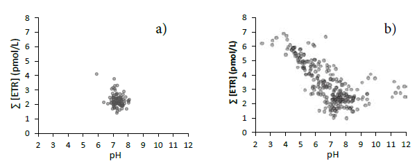 La concentración de ETR en función del pH para la zona de estudio se observa en la Figura 9a, donde el rango de variación del pH es entre 5.9 y 8.08, con un promedio de 7.29 y una varianza de 0.12. Este rango es consistente con los resultados obtenidos en el mundo (Figura 9b) (Noak et al., 2014).