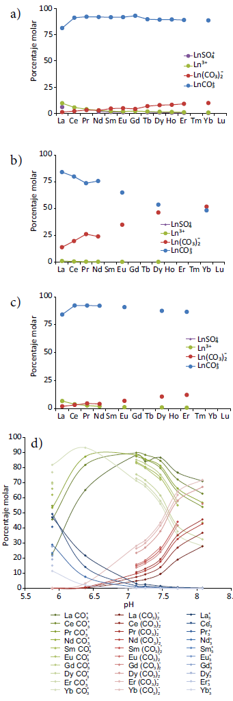 Los resultados obtenidos para cada una de las muestras se presentan en la Figura 10a–10c, donde se grafica el porcentaje molar de cada uno de los ETR, mientras que en la Figura 10d se muestra la especiación en función del pH. Dado el dominio de la familia de agua bicarbonatada sódica en la zona de estudio (Ortega-Guerrero 2000; CEAG, 2001), los complejos acuosos de ETR dominantes son los carbonatos, específicamente LnCO + y Ln(CO ) -, donde Ln es el ETR en cuestión. Es oportuno indicar que el predominio de los complejos carbonatados en aguas subterráneas de pH cercano a neutral ha sido documentado en diferentes lugares del mundo por diferentes autores (Johannesson et al., 1997; Yuan et al., 2014; Nelson et al., 2015; Sikakwe et al., 2016).