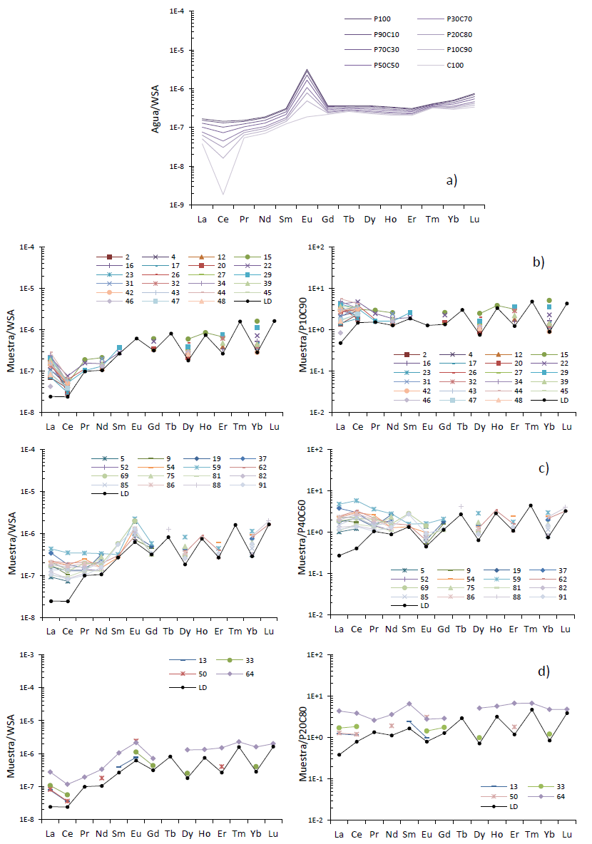 Aunque no se cuenta con la firma geoquímica de las rocas marinas de la base de la secuencia estratigráfica ni con la de los sedimentos de relleno del acuífero granular de la zona, se utilizó el programa geoquímico PHREEQC para simular la composición de ETR bajo diferentes mezclas de agua característica de rocas marinas, identificada como C100, y agua proveniente del acuífero granular, cuya firma puede ser atribuida en mayor medida a las plagioclasas de los basaltos de la FVTM, identificada como P100. En la Figura 11a se muestran los resultados de estas simulaciones. En la Figura 11b se presentan muestras de la Familia A normalizadas al Promedio Mundial de Lutita (WSA) y a la mezcla de agua de rocas marinas (P10C90) en 90 % y del acuífero granular en 10 %; en la Figura 11c se encuentran muestras de la Familia C normalizadas a Lutita (WSA) y a la mezcla P40C60; y en la Figura 11d se grafica la mezcla P20C80 para muestras seleccionadas de la Familias A, C e I, normalizadas a Lutita (WSA).