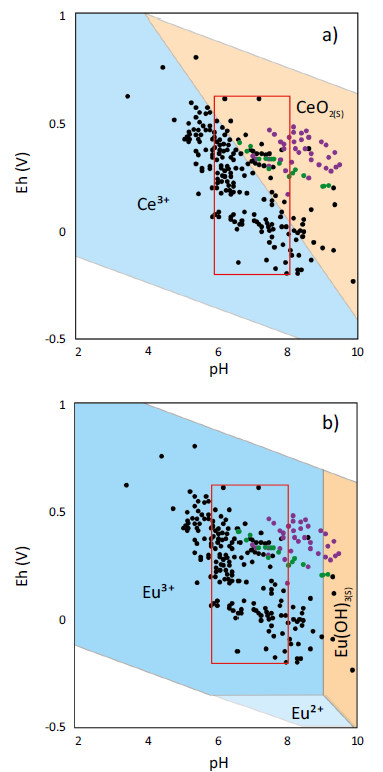 El diagrama de estabilidad Eh-pH de Eu se presenta en la Figura 12b; este diagrama considera los datos de este estudio, donde el rango de variación del Eh en acuíferos regionales en el centro de México es entre 0.2 y 0.4 V (Ortega-Guerrero, 2017) y los datos de Noack et al. (2014) con muestras de agua subterránea de diferentes partes del mundo. Las anomalías positivas y negativas de Eu pueden tener un origen común que es la incorporación de Eu2+ en las plagioclasas cálcicas, ya que por su relación carga/radio iónico, el Eu2+ puede sustituir al Ca2+ en su estructura cristalina. Sin embargo, es demasiado grande para entrar en otras fases como los clinopiroxenos, fase presente en los magmas menos evolucionados. En la medida en que el Eu2+ se incorpora a las plagioclasas, el Eu se agota en el magma respecto a los otros ETR, generando empobrecimiento en las rocas ígneas más evolucionadas (Henderson, 1984). En la zona de estudio se han reportado anomalías negativas de Eu en las rocas félsicas (Figuras 3 y 4), de las cuales las rocas de la SMOcc presentan la mayor magnitud. Las anomalías positivas de Eu, por otra parte, están presentes en las rocas de composición intermedia a máfica de la FVTM (Figura 3).