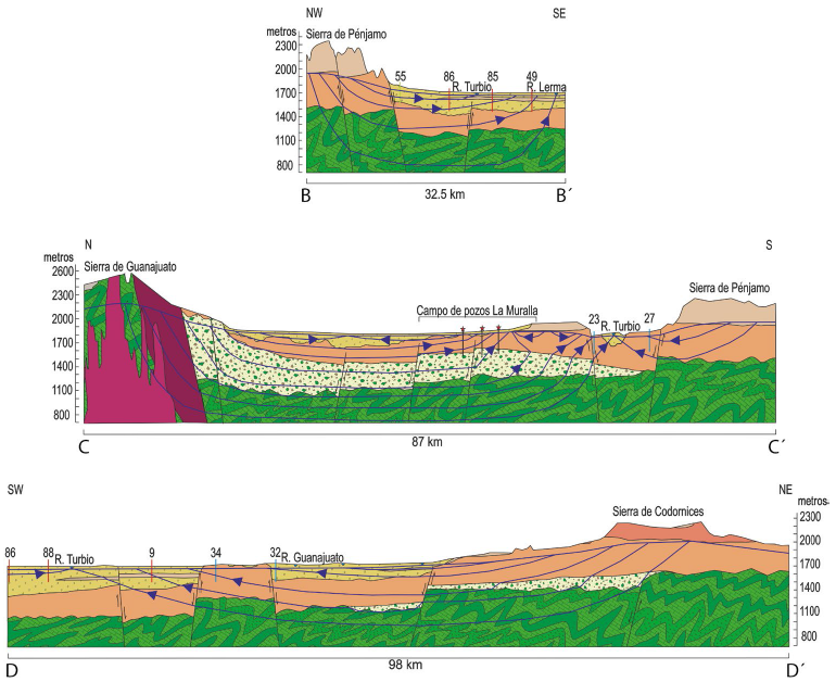 Con todo lo anterior, se propone un modelo conceptual del funcionamiento del agua subterránea, a partir de la interacción con las diferentes unidades rocosas en el Bajio de Guanajuato, en el que se explicarían los patrones de ETR observados en el agua subterránea del área de estudio, bajo el concepto de SFAS (Freeze y Witherpoon, 1966,1967, 1968; Ortega-Guerrero y Farvolden, 1989; Tóth, 1999; Morales-Casique et al., 2016). Tales patrones se muestran en las secciones hidrogeológicas esquemáticas de las Figuras 13 y 14.