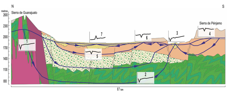 A pesar de la falta de información hidráulica de las rocas de la secuencia vulcano-sedimentaria mesozoica, la CEAG (2001) las define como el basamento hidrogeológico, lo cual resulta lógico si se considera la deformación a las que han sido sometidas. Sin embargo, como se verá más adelante, los patrones de ETR normalizados al Promedio Mundial de Lutita (WSA, por sus siglas en inglés) evidencian que hay flujo de agua subterránea a través de las calizas mesozoicas. Por esta razón, aunque con una conductividad hidráulica menor respecto a los acuíferos ya mencionados, las rocas marinas de la secuencia vulcanosedimentaria, por lo menos las calizas, también pueden ser consideradas como parte del sistema de flujo de agua subterránea. Los flujos basálticos compactos y capas delgadas de material arcilloso cenozoico de baja conductividad hidráulica se encuentran intercalados en la secuencia, separando los grandes espesores de materiales de mayor conductividad hidráulica (CEAG, 2001).