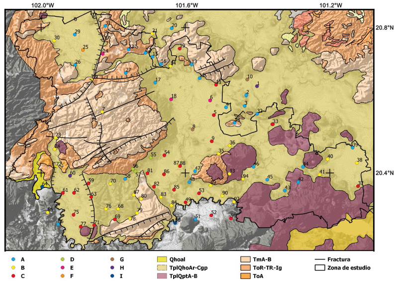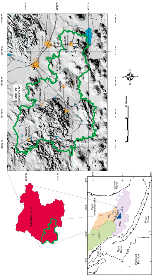 La zona de estudio está localizada en el límite de dos provincias fisiográficas: la Mesa Central (MC) al norte y la Faja Volcánica Transmexicana (FVTM) al sur, separadas por la Falla del Bajío, de desplazamiento normal y que da lugar a la depresión del mismo nombre (Nieto-Samaniego et al., 2007) (Figura 1a). A su vez, en la región se puede observar la transición espacio-temporal de la actividad volcánica de la Sierra Madre Occidental (SMOcc) con la FVTM, generada por la reorganización del esquema tectónico del arco del Pacífico durante el Mioceno temprano; esta transición trae consigo un marcado cambio composicional de los magmas félsicos de la SMOcc al predominio de los basaltos y andesitas efusivos de la FVTM (Ferrari et al., 1999; Cerca et al., 2000).