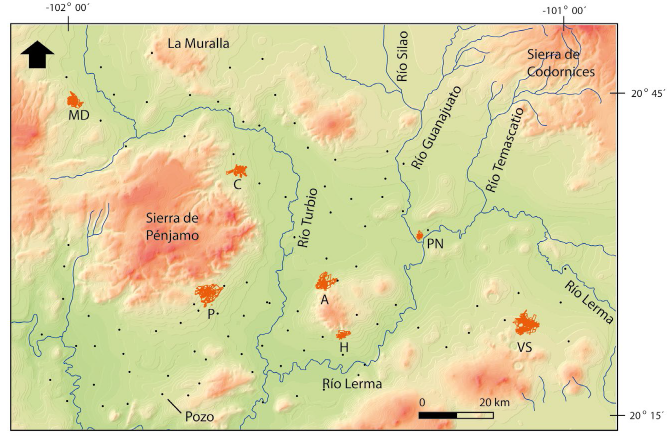 La Mesa Central, ubicada entre las provincias fisiográficas de la Sierra Madre Occidental y la Sierra Madre Oriental (SMO), corresponde a un altiplano cuya elevación promedio, de 2250 msnm, supera y contrasta con la de sus alrededores, que son menores a 1800 msnm (Nieto-Samaniego et al., 1997; Nieto-Samaniego et al., 2007). Localmente, en la Sierra de Guanajuato en el extremo meridional de la Mesa Central, afloran las unidades litológicas más antiguas de la zona de estudio (Figura 2), conformadas por rocas marinas del Jurásico Tardío al Cretácico Temprano que se consideran como parte del Terreno Guerrero (Alaníz-Álvarez et al., 2001; Aranda-Gómez et al., 2003; Nieto-Samaniego et al., 2007). Rocas continentales cenozoicas, tanto volcánicas como de cuencas fluviales-lacustres y depósitos aluviales, cubren discordantemente a las rocas mesozoicas y conforman la mayor parte de los afloramientos en la zona de estudio (Nieto-Samaniego et al., 2007; SGM, 1997). Próximo al límite con la FVTM, predominan las ignimbritas y riolitas del Oligoceno (Aranda-Gómez et al., 2003; Nieto-Samaniego et al., 2007; Aguillón-Robles et al., 2009) cuyo origen se atribuye al vulcanismo de la SMOcc (Aranda-Gómez et al., 2003). La SMOcc es el arco volcánico del Cretácico Tardío al Mioceno temprano generado durante la subducción de la Placa Farallón bajo la Placa de Norteamérica. La parte basal corresponde a un complejo plutónico-volcánico que se emplazó hasta el Eoceno (Figura 1a). La secuencia superior, del Eoceno al Mioceno medio, comprende aproximadamente 1000 metros de espesor de rocas volcánicas silícicas que afloran a lo largo de una franja de cerca de 1200 km de largo y 300 km de ancho que corre paralela a la costa del océano Pacífico de México (Cerca et al., 2000).