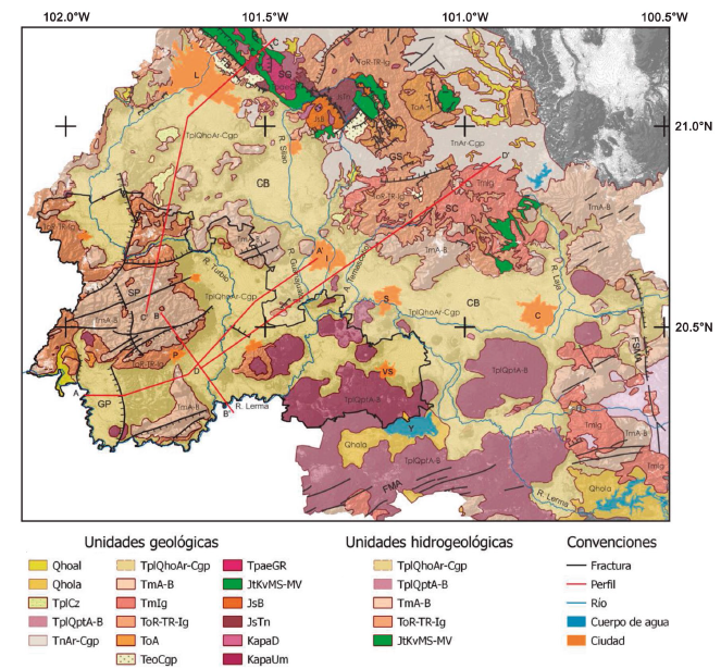 La zona de estudio está comprendida dentro de los denominados acuíferos administrativos de Pénjamo-Abasolo y Río Turbio, y parcialmente en los acuíferos administrativos de Irapuato-Valle y La Muralla (CEAG, 2001). La explotación de estos acuíferos empezó en la década de 1970 a través de pozos de entre 80 y 120 metros de profundidad, donde el agua era extraída principalmente de sedimentos lacustres. A pesar de la veda instaurada en la década de 1980 para evitar el bombeo excesivo del acuífero, éste presenta un alto grado de abatimiento de los niveles piezométricos (CEAG, 2001); el estudio citado contiene adicionalmente información litológica, hidráulica e hidrogeoquímica.