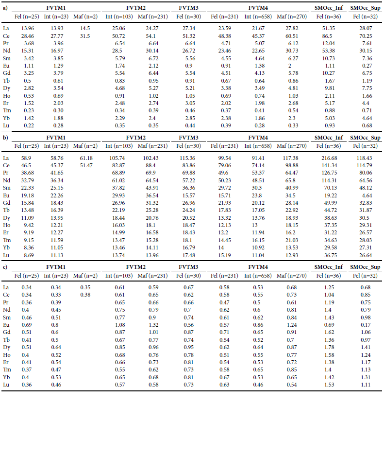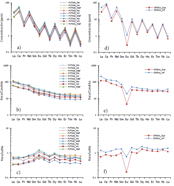 En general, el promedio de la concentración de ETR es mayor en las rocas de la SMOcc (Figura 3d) que en las de la FVTM (Figura 3a); mientras que, los patrones de ETR de las rocas normalizados a Condrita (NC) (Figuras 3b y 3e) difieren de los normalizados a Lutita (Figuras 3c y 3f). La normalización con respecto a Condrita muestra sólo una anomalía de Eu para las rocas del vulcanismo silícico del Mioceno tardío al Plioceno temprano (FVTM3-Fel) (Figura 3b); en cambio, para las rocas de la SMOcc, ambos grupos presentan una marcada anomalía de Eu (Figura 3e). En cuanto a los patrones que define la normalización a Lutita, se mantiene la anomalía negativa de Eu en las rocas de la SMOcc (Figura 3f), que contrastan con una anomalía positiva de Eu en todas las rocas de la FVTM, excepto los promedios de composición félsica de FVTM3 y FVMT4.