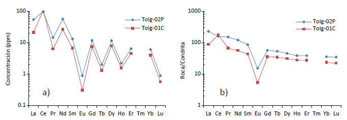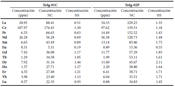La concentración de ETR en rocas de la Sierra de Pénjamo se muestran en la Tabla 2 y en la gráfica de la Figura 4a, donde las concentraciones de Ce son de 107.97 (ToIg-01C) y 97.62 ppm (ToIg-02P); mientras que la concentración de ETR normalizados con respecto a Condrita presenta una anomalía de Eu (Figura 4b), con valores de -0.67 (ToIg-02P) y -0.87 (ToIg-01C).