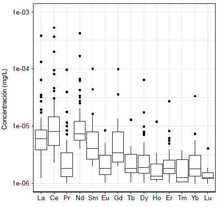 La ubicación de las muestras se muestra en la Figura 5, donde se incluye la litología regional. En la Figura 6 se presenta el diagrama de caja, el cual muestra el rango de concentración de ∑ETR disueltos en agua subterránea, la mediana, la dispersión y la simetría de las 94 muestras analizadas. El Ce se encuentra en un amplio rango de concentración, desde unos cuantos nanogramos por litro hasta concentraciones cercanas a 0.5 mg/L. El 46 % de los ETR como el terbio (Tb), holmio (Ho), tulio (Tm) y lutecio (Lu) se encuentran por debajo del límite de detección. Sin embargo, esto no representa una limitación a la interpretación en el comportamiento de otros elementos, cuyas concentraciones y anomalías pueden ser representativas de la interacción agua-roca y de las reacciones asociadas.