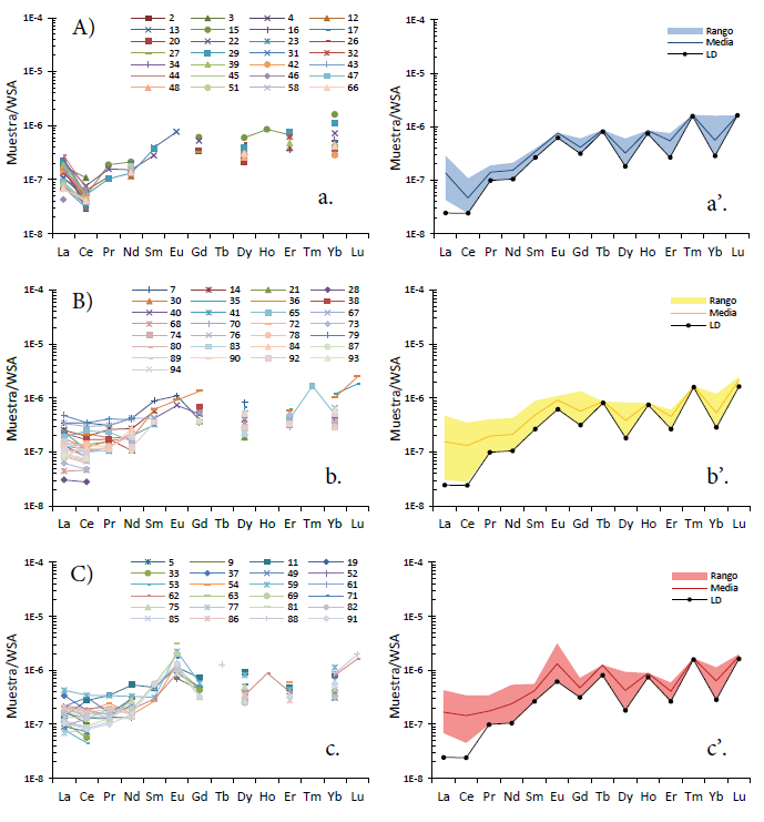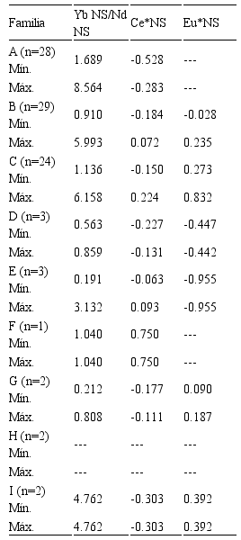 A partir de estos dos criterios, 81 muestras son consideradas en los grupos A, B y C donde la relación YbNS/NdNS muestra, en general, enriquecimiento de los ETRP sobre los ETRL (Figuras 7a–7c). El rango de variación en las concentraciones, la media y el límite de detección de estas tres familias se muestra en las Figuras 7a´–7c´. Las trece muestras restantes se clasificaron en los grupos D a I (Figuras 8a–8f). El grupo A presenta una anomalía negativa de Ce muy pronunciada (Ce*NS < -0.25), las concentraciones de Eu son relativamente bajas por lo que no es posible determinar la magnitud de la anomalía, y el rango de ETRL es más acotado que en B y C. El grupo C presenta anomalías de Ce muy pequeñas (-0.25 < Ce*NS < 0.25) y anomalías de Eu fuertemente positivas (Eu*NS > 0.25). Por otra parte, el grupo B representa condiciones intermedias entre A y C con anomalías muy pequeñas tanto de Ce como de Eu y un amplio rango de concentraciones de ETRL, a excepción del Eu.