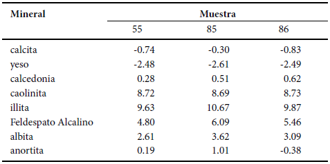 Los Índices de Saturación (SI, por sus siglas en inglés) de los principales minerales que pueden formar ETR, calculados por el programa PHREEQC, se muestran en la Tabla 4 y de otros minerales de interés en la Tabla 5. Los compuestos de ETR están, en general, sub-saturados en el agua subterránea y por tanto ésta puede incorporarlos a través de su disolución (Tabla 5). La calcita y el yeso, que pueden incorporar ETR en su estructura cristalina por su similitud en el radio iónico con el Ca+2 (Noack et al., 2014), también presentan condiciones de subsaturación; en contraste, el feldespato alcalino, la albita, arcillas como la caolinita y la illita, y la calcedonia, que también pueden incorporar ETR en su estructura, presentan índices de saturación positivos (Tabla 5). La sobresaturación de feldespatos y arcillas indica una intensificada disolución de feldespatos, generando una alta tasa de formación de arcillas.