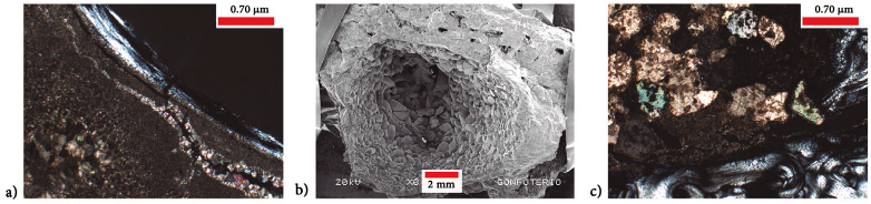 When the spaces were filled, after the sparitic layer there was another micritic filling (Figure 9a) and a sandy mixture of minerals and volcanic rocks cemented with micrite or sparite. The minerals in the sand were identified as plagioclase, bone fragments, sparite with the signs of etching, amphiboles, quartz and volcanic glass (Figure 10); we also found a great amount of clays and phytoliths.