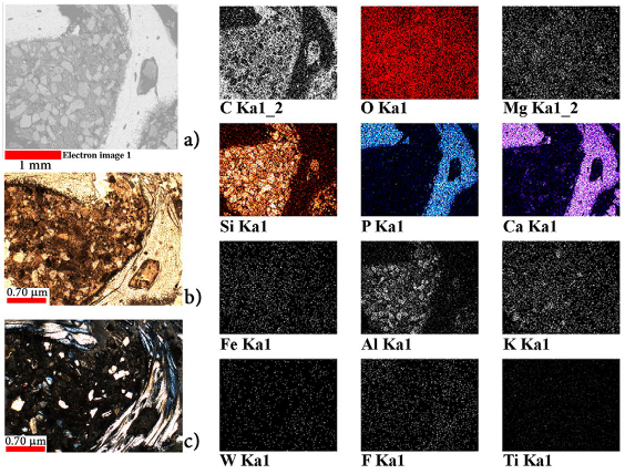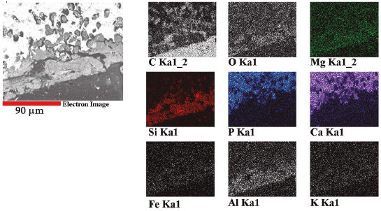 Thin sections showed a material with no birefringence in the surface area of the sampled bones composed mainly of Si, Al, O, Mg, Fe, and K (Figure 7c-3 and Figure 8), over this layer a micritic one can be found. At the surfaces that exhibited the tunneling, but not the layer of minerals without birefringence, the voids have been filled with micrite.