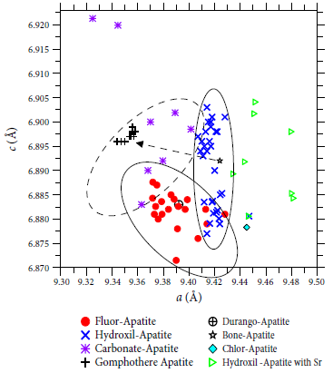Apatite is a mineral group with complex solid solutions. In order to simplify, the International Mineralogical Association (IMA) accepted minerals considering three end members: hydroxylapatite, fluorapatite and chlorapatite (Chang et al., 1996; Back, 2014). The different size of monovalent anions (F-, Cl-, OH-) determines a variation in cell parameters. The informal names francolite and dahllite have been applied for apatites enriched in CO2 and fluorine, and apatites enriched only in CO2, respectively (Deer et al., 2013).