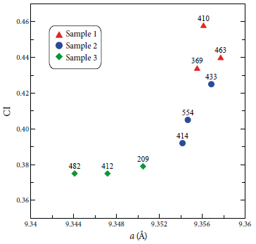 The aliquots of sample number 3 have small . cell parameter values, more amount of CO2 and smaller crystallinity index.