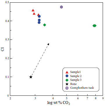 The carbonate-apatite mineral phase in the skull bone has a negative correlation between “crystallinity index” and CO2 amount and a cell parameter (Figures 12 and 13). Carbonate has the effect of making the apatite less crystalline (e.g. Nemliher et al., 2004). In the studied samples it can be prove this as an indirect relationship between CO2 content and “crystallinity index” (Figure 13). Sample 3 is enriched in CO2 and because of that it is less crystalline and has a smaller crystallite size value. Carbonate in apatite constrains the crystallinity to nanometric scale and gomfotherium fragments have quite big size values of crystallite. Therefore, we suggested a partial isomorphous exchange of carbonate by fluorine in apatite as a result of the diagenetic processes.