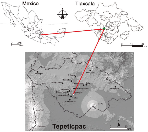The discovery took place on an alluvial deposit exposed by a crosscutting road on the hillslopes of Tenextepetl hill, which is part of a mountain chain system that elevates around 300 meters above the Puebla-Tlaxcala valley and that separates the bottom of the valley to the south from the elevated Tlaxcala Block to the north.