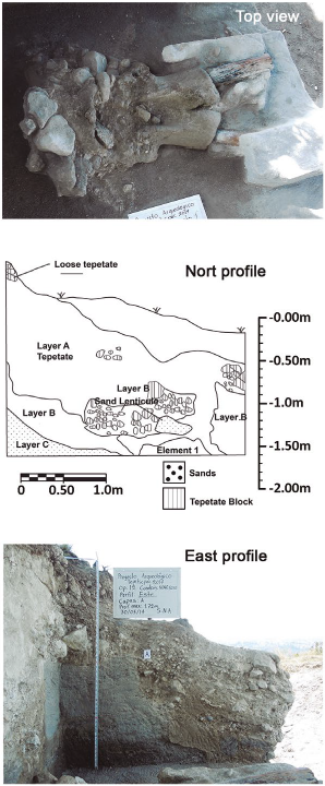 The uppermost stratum was formed of 20 to 30 centimeters of loosened tepetate rock that had a steep north to south inclination, which matches the present day-slope surface. It contained no paleontological remains. Below the upper stratum lays Layer A, a colluvial stratum consisting of blocks of medium size blocks (10 to 20 cm) of calcareous rocks and fragments of tepetate rock (fragipan–indurated tephra material). The deposit also had a north to south slope and a thickness of around 1 meter; it was strongly compacted, although some sand lenticular deposits were observed on the north and west profiles.